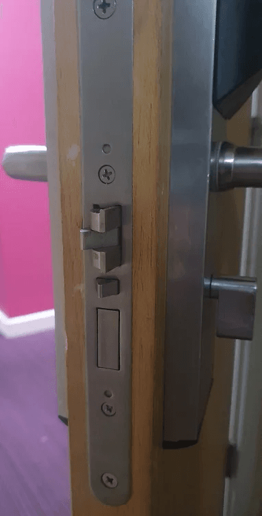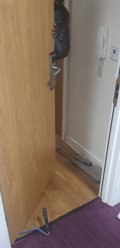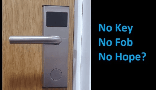 Apartment door working on fob only, meaning tenants only have a fob to access and egress their flat, and that’s it. No keys. See below for a visual. Unfortunately, today’s customer left his fob inside, and went out for the night.
