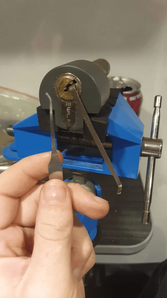 Now, there was no lock to pick on this job, so as a consolation prize, here are a couple pictures of me picking a similar lock from her front and back doors, on the bench I have set up in the van: